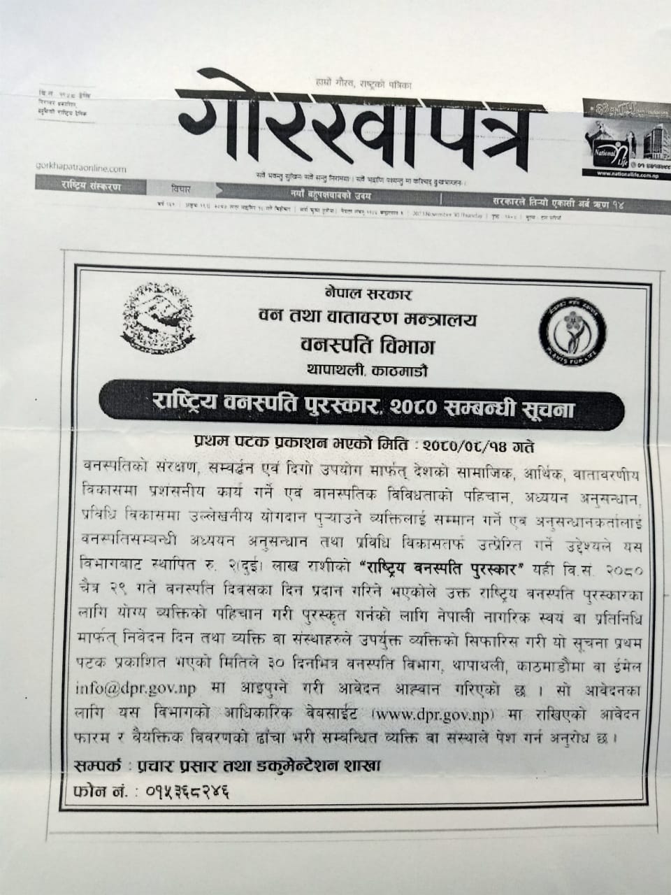राष्ट्रिय वनस्पति पुरस्कार, २०८० सम्बन्धी सूचना।