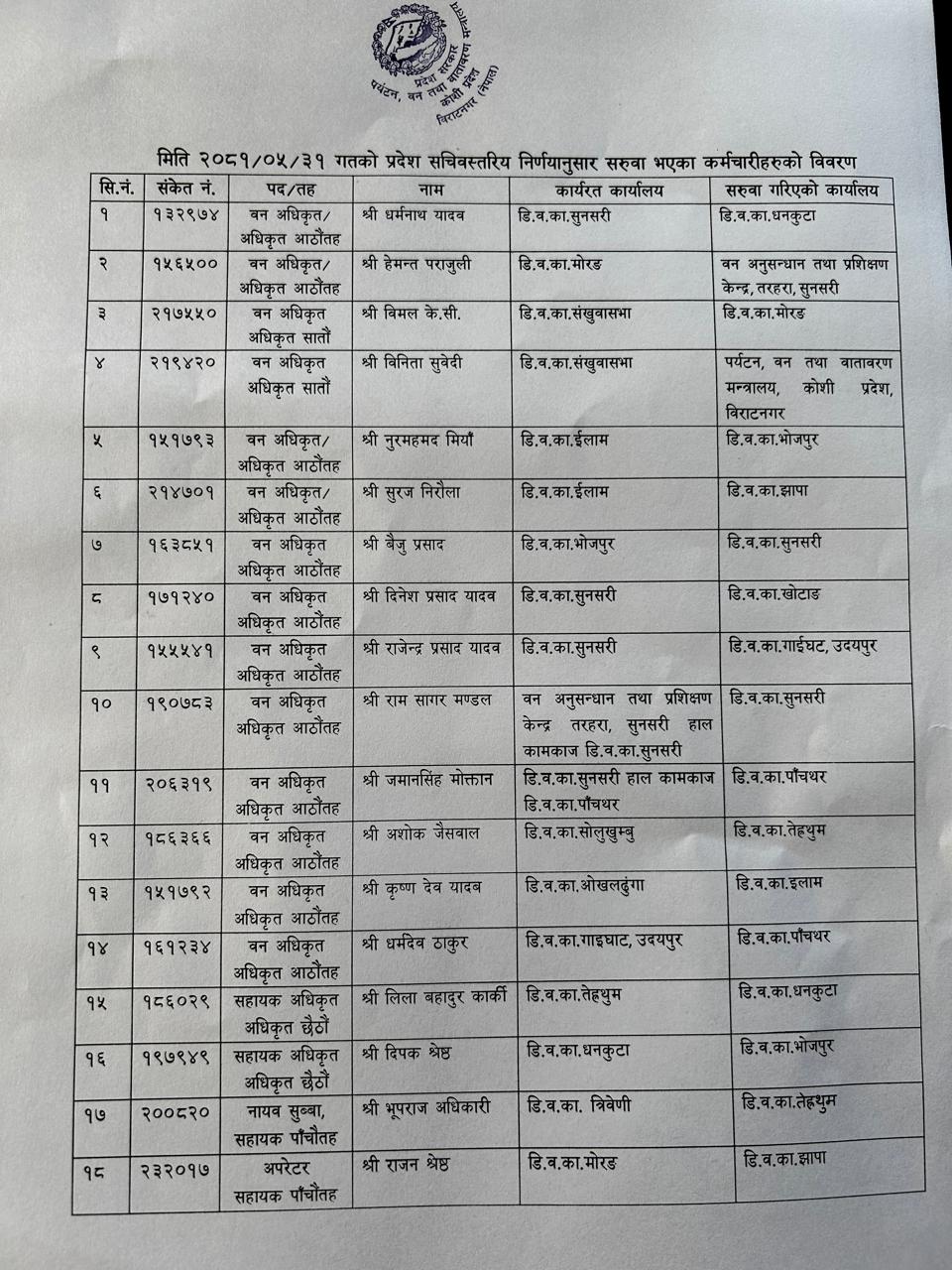 मिति २०८१।०५।३१ गतेको प्रदेश सचिवस्तरीय निर्णयानुसार सरूवा भएका कर्मचारीहरूको विवरण